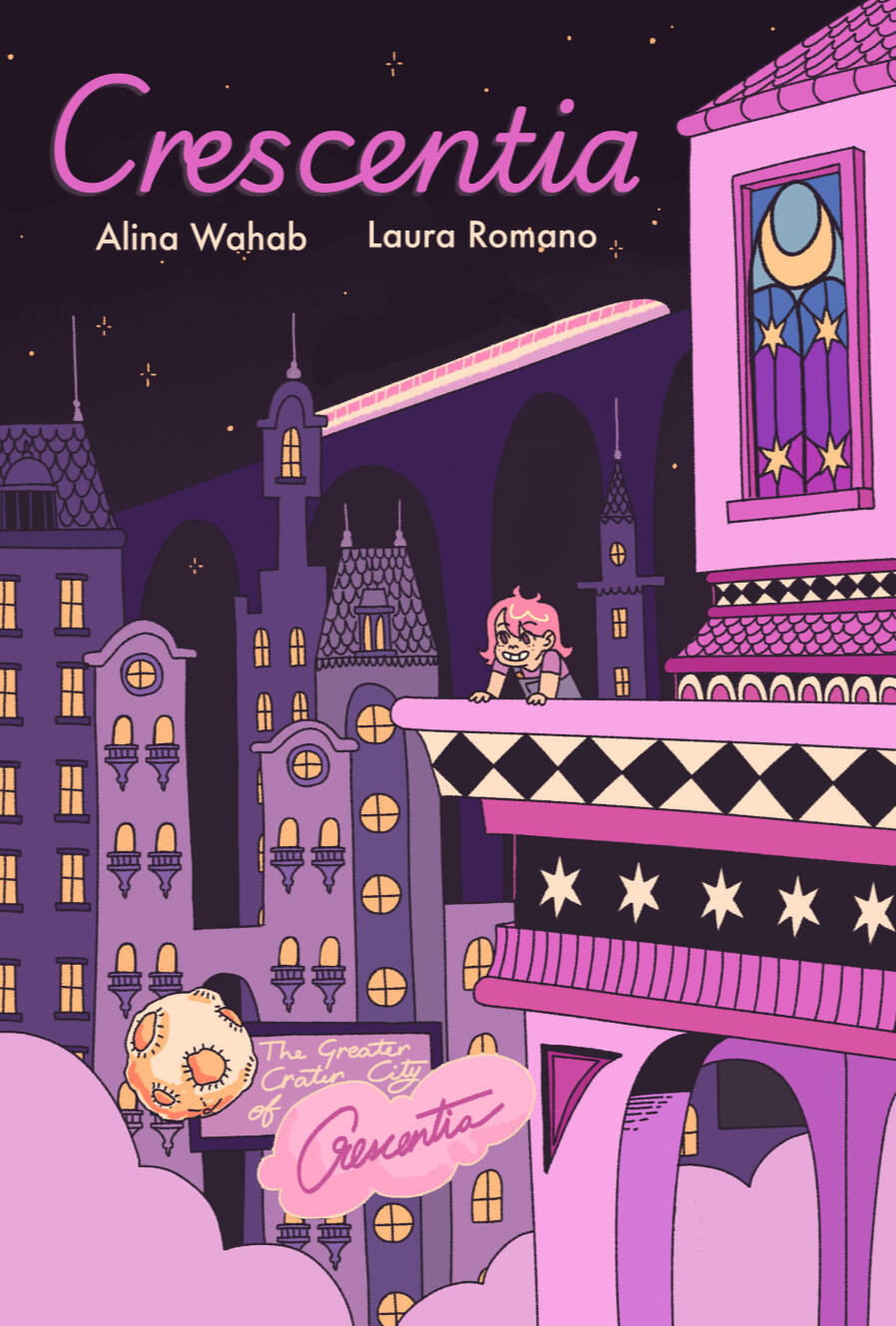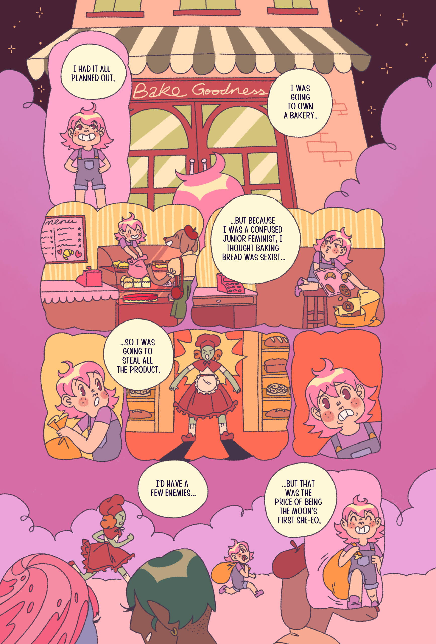 Crescentia (2024)Crescentia is ten page comic about a young woman at a housewarming party reminiscing about the fantastical moon city she imagined as a child. A story about anxiety and expectations, but also fruit juice faucets and stealing bread... but for feminism?You can read the comic here and check out the first four pages of the comic script here!Crescentia was drawn by Alina Wahab and written by myself for The City We Chose anthology published by Toronto Comix after a successful crowdfunding campaign.I also did a few interviews on Crescentia, one for the Cartoonist Cooperative for the Nib & Ink Fest 2025 on their journal and one with Toronto Comix on their Twitter and Instagram.