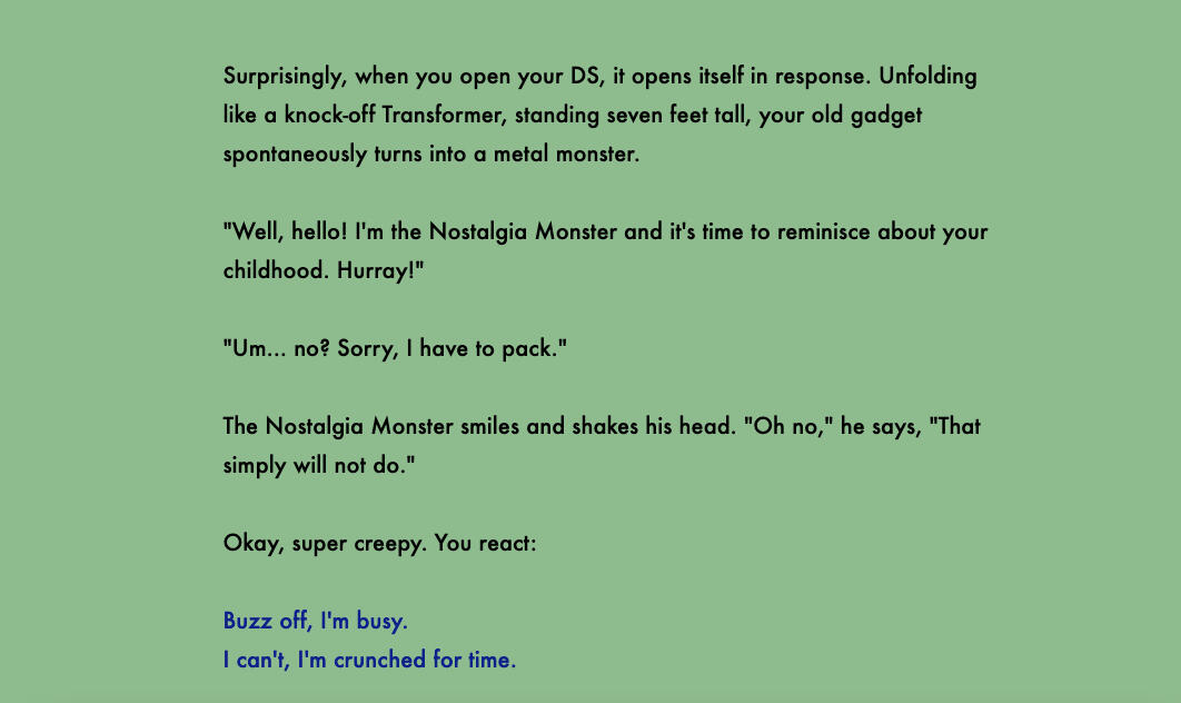 Oh No, You Summoned The Nostalgia Monster! (2021)Oh No, You Summoned The Nostalgia Monster! is a short, text-based horror comedy interactive fiction game about a metal monster who is very violent and wants to reminisce about your childhood. Your objective is to survive, good luck!Content Warning: Text-only horror descriptions of (not super graphic) lethal violence.This game was featured in the Gender Constellation Bundle hosted by Game Dev Galaxy on itch.io!Role: Solo devPlay the game on itch.io!