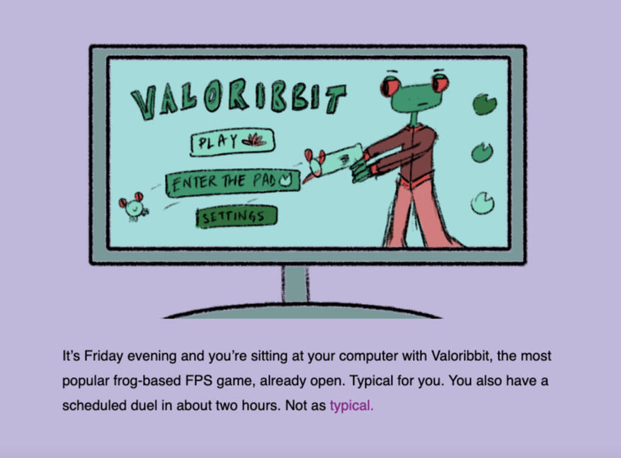 Top Frogging (2022)Top Frogging is illustrated interactive fiction game about a frog-based shooter... and also misogyny! After a classmate doubts her Valoribbit skills, teenage gamer Bianca vows to win a 1v1 to teach him a lesson, but ends up learning an important truth herself.This game was created for the 7th Narrative Driven Jam.Role: Solo devPlay the game on itch.io!