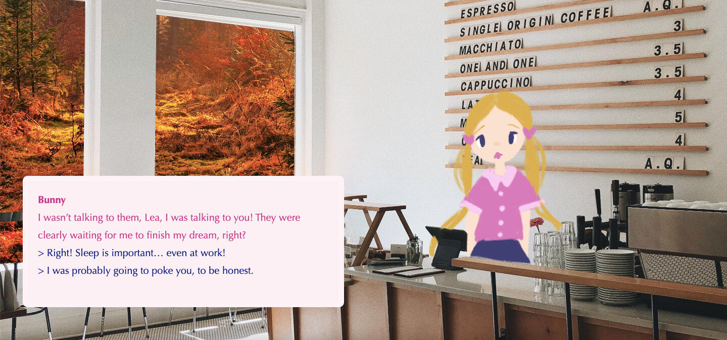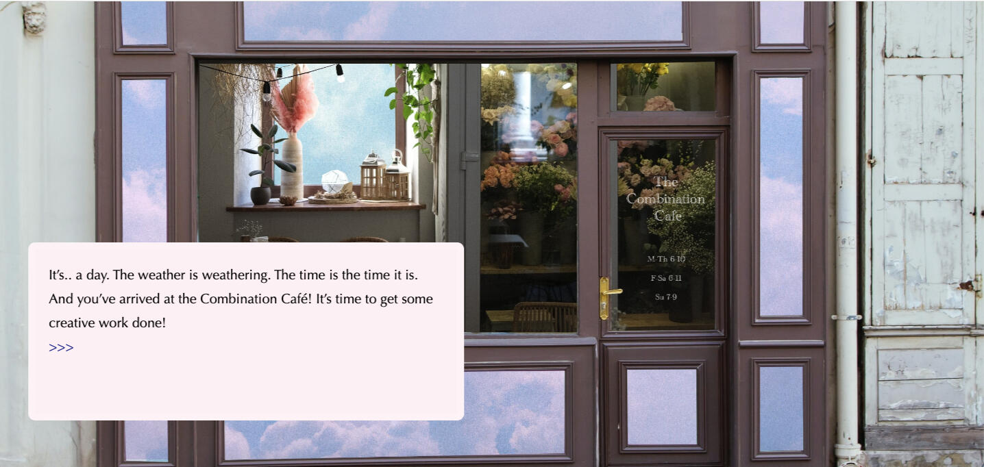The Combination Café (2023)The Combination Café is part café visit, part visual novel, and part creative prompt game. Have a chat, grab a drink, and make something during your stay!This game is the first in the Creative Block series, a collection of games that encourage creative play by asking the player to follow specific prompt constraints when making something. Per the name, this game focuses on how the act of combining things can help you create something new!Role: Solo devPlay the game on itch.io!