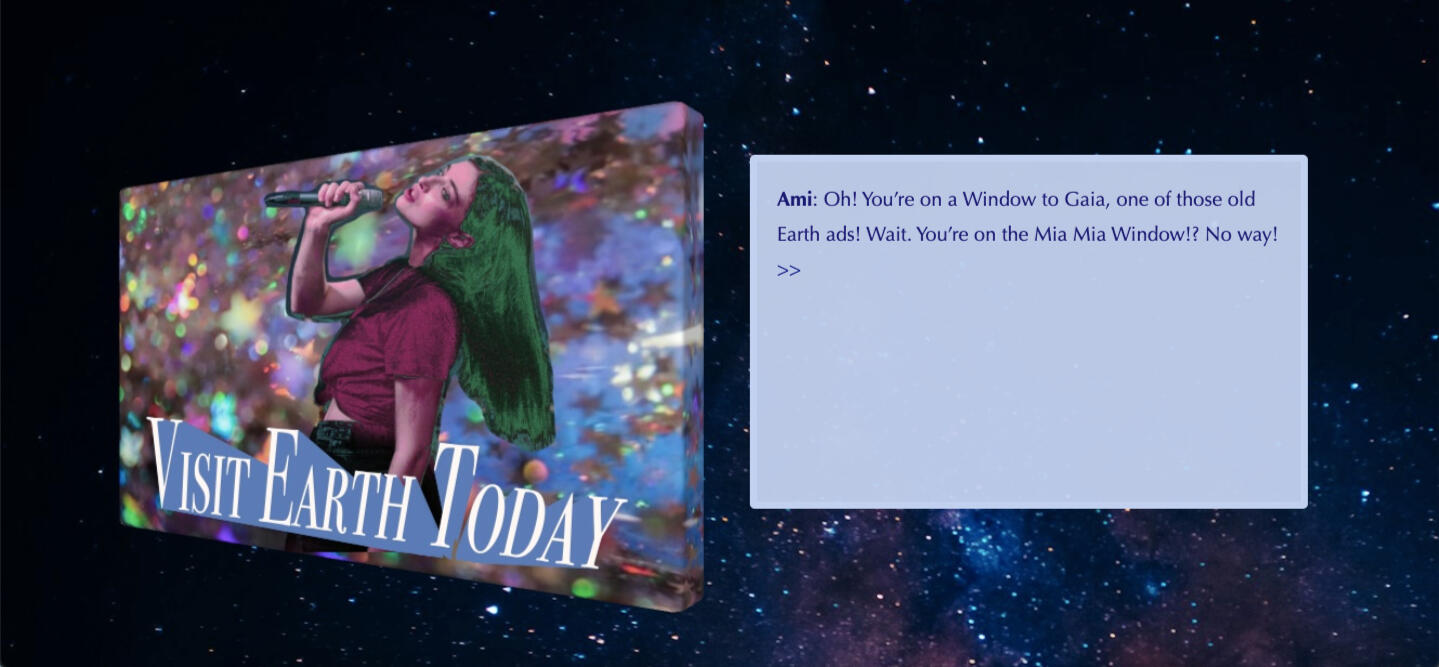 Window to Gaia (2024)Window to Gaia is a narrative sci-fi game about pop stars, space billboards, and a glitching HoloFloor.WTG was featured in the first semi-anonymous game jam for LITHOBREAKERS. All games in utilized the theme of defenestration, or the act of pushing someone out of a window.Role: Solo devPlay the game on itch.io!