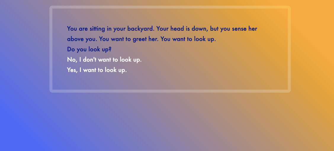 The Call to the Sun (2021)The Call to the Sun takes one through the brief, horrific experience of sitting outside and feeling, well, the call to the sun. This short horror game is in an interactive fiction piece made in Twine in 2021 for the Pixelles Writing Portfolio Program.Content Warning: Text-only horror descriptions involving self-harm, light gore, and intrusive thoughts.Role: Solo devPlay the game on itch.io!